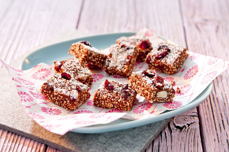 Mix-ul astfel obtinut se intinde pe o foaie de copt, se presara deasupra merisoarele si fulgii de cocos si se pune apoi la rece.